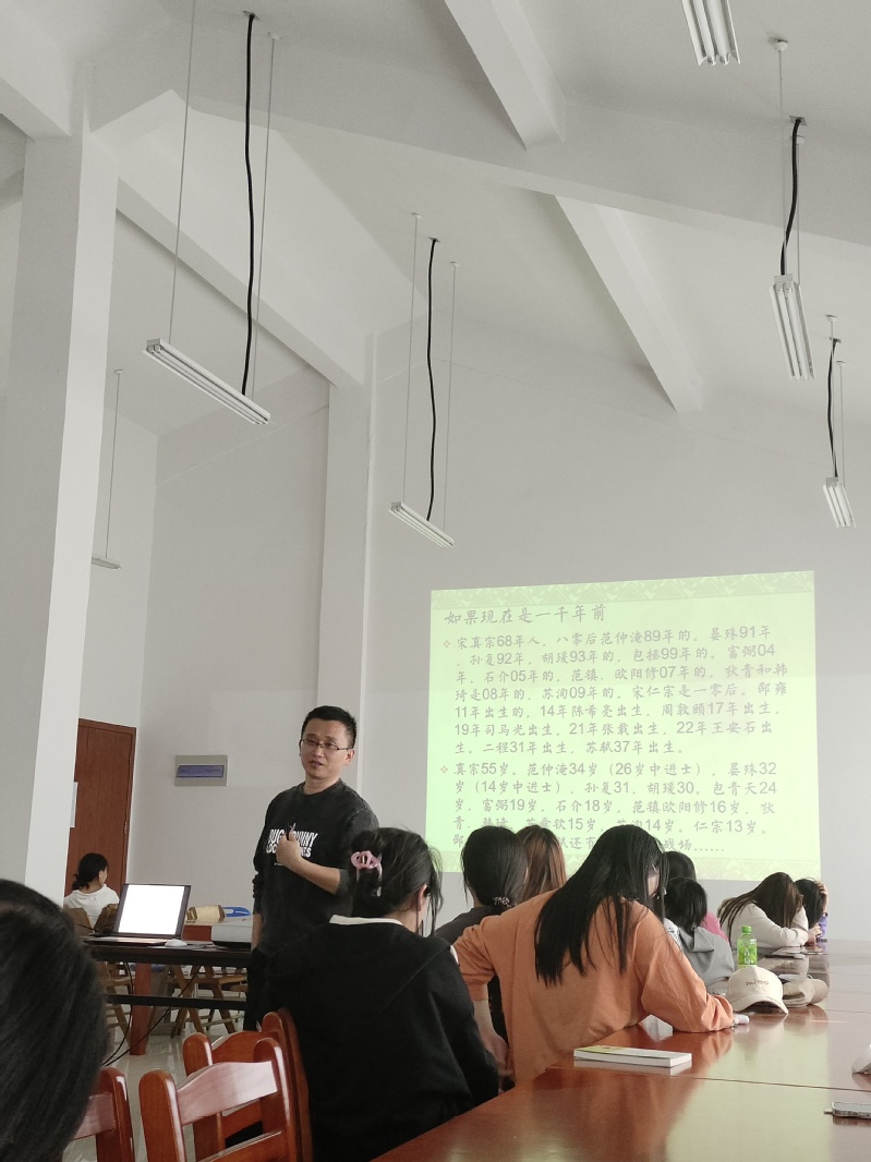本次活动中,主讲人首先介绍了我校图书馆宋史相关馆藏书目。紧接着,他带领同学们了解北宋背景及各个“官家”。主讲人还向同学们介绍了“簪花少年”之意——年轻有为、精神无拘束、勇于承担时代重任。然后依照时间顺序介绍北宋历代名臣事迹,并与《明儒学案》做对比,让同学们多视角、立体看待千年前的读书人。