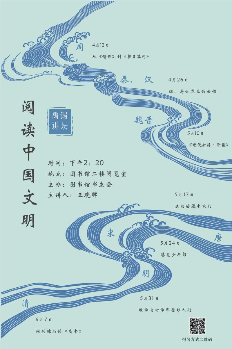 为响应习近平总书记全民阅读的号召,丰富校园文化建设,让同学们更好地阅读中国文明经典,了解中国的优秀传统文化,我校图书馆在滨江校区开展首期阅读推广活动,本学期为“禹锡讲坛”——“阅读中国文明”系列讲座。2023年4月12日(周三)下午2:20--3:20,在滨江图书馆(后勤楼)二楼阅览室成功举办。此次讲座题目为《簪花少年郎——北宋的妙人们》,主讲人是王晓晖。